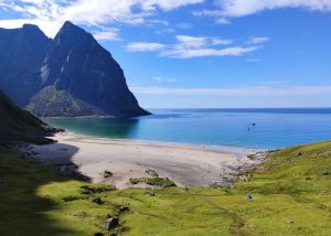 Wir sind überrascht. Bisher verbinden wir die Lofoten mit Stockfisch, Bergen und Meer. Wir haben nicht geahnt, das diese Inselgruppe weiße Sandstrände und türkisfarbenes Wasser zu bieten hat. Wir fühlen uns manchmal wie an einem Karibik-Strand inmitten der Alpen 🙂 Besonders eindrucksvoll ist unsere Wandertour an den Kvalvika-Beach. Der Strand liegt tief zwischen hohen Bergfelsen. Träge kommen die Wellen aus dem Nordatlantik angerollt und laufen weiß schäumend am flachen Ufer aus. Als wir vollbepackt mit