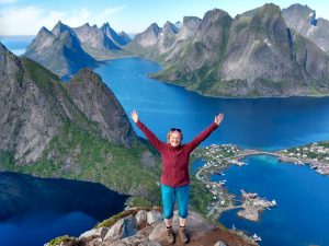 Über dem kleinen Lofoten-Fischerort Reine steigt die Bergspitze Reinebringen auf. Ein fantastischer Aussichtspunkt mit einem kleinen Haken: Der Weg dorthin zieht sich steil direkt die fast senkrechte Bergflanke hinauf. Da die Wanderung so beliebt ist, hat man den Weg inzwischen gut befestigt und in Form von über 1650 Stufen ausgebaut. Wir starten im strahlenden Sonnenschein und freuen uns auf den ersten Metern noch über ein wenig Schatten, als wir uns mit Rucksack und Wasserflaschen bepackt
