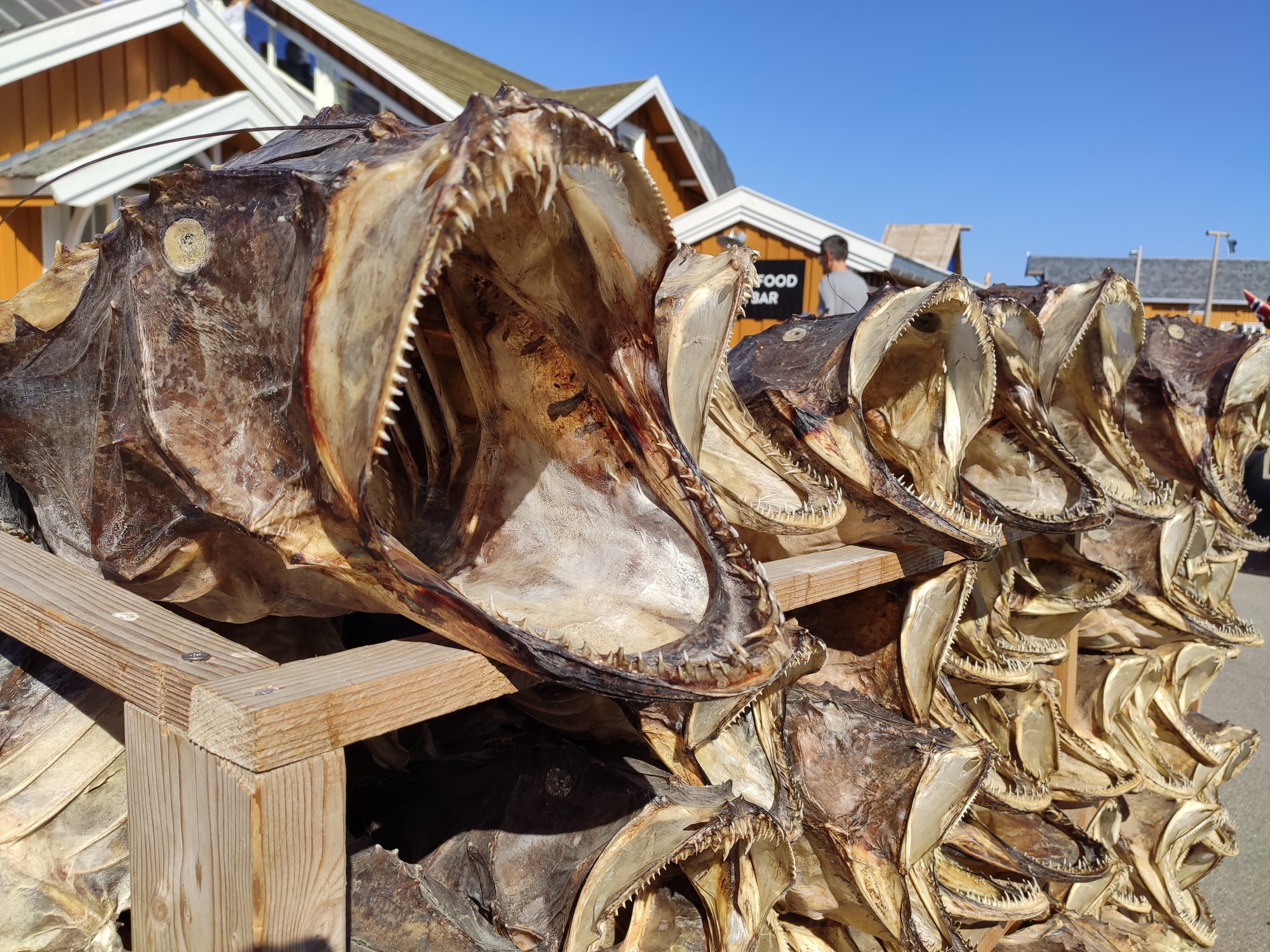 Überall begegnen uns auf den Lofoten riesige Holzgestelle an denen unheimlich aussehende Fischköpfe und Fischkörper hängen. Dahinter steckt die die faszinierende Geschichte des Stockfisches, und seiner großen wirtschaftlichen Bedeutung seit Jahrhunderten für die Lofoten und ganz Norwegen. Was ist überhaupt Stockfisch? Es handelt sich hierbei meistens um Kabeljau (Dorsch), der auf Gestellen (=Holzstöcken) getrocknet wird. Es gibt auch Klippfisch, in dem Fall wird der Fisch auf Klippen zum Trocknen ausgelegt. Ein großer Kabeljau-Schwarm kommt regelmäßig